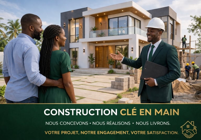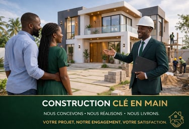 Confiez-nous votre projet immobilier de bout en bout. Notre formule clé en main vous libère de toutes les contraintes liées à la construction : recrutement des artisans, coordination des corps de métier, gestion des approvisionnements, respect du budget et des délais. Vous définissez vos besoins et votre budget — nous livrons votre bien prêt à habiter ou à exploiter. Une solution idéale pour les clients résidant à l'étranger ou manquant de disponibilité.