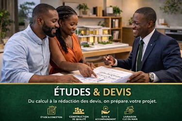 Avant de construire, il faut bien chiffrer. Notre équipe technique réalise pour vous des études de faisabilité et des devis détaillés et transparents, tenant compte de la nature du terrain, des matériaux, de la main-d'œuvre et des normes en vigueur. Pas de mauvaises surprises : vous savez exactement où vous allez avant de poser la première pierre.