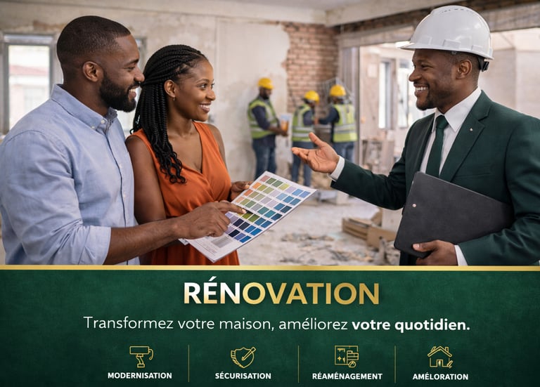 Votre bien immobilier a besoin d'un second souffle ? Que ce soit pour une rénovation partielle (peinture, carrelage, électricité, plomberie) ou une réhabilitation complète, NAZA Immo mobilise des artisans qualifiés pour redonner vie à votre propriété. Nous intervenons sur les logements, les locaux commerciaux et les immeubles, avec des devis clairs et un suivi professionnel jusqu'à la réception des travaux.